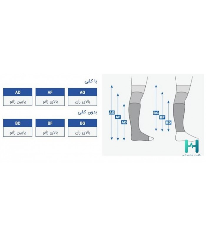با کف بالای ران (AG)، با کف بالای زانو (AF)، با کف زیر زانو (AD)، بدون کف بالای ران (BG)، بدون کف بالای زانو (BF)، بدون کف زیر زانو (BD)